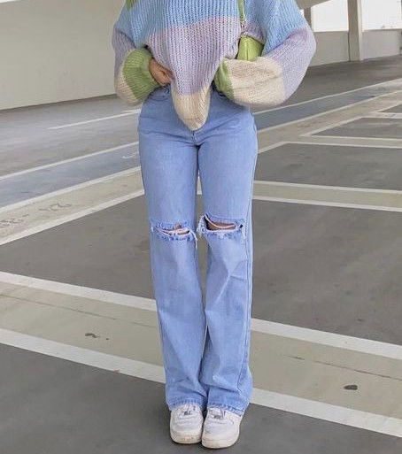 Upgrade your casual style with these chic high-waist ripped straight jeans. Designed for comfort and a relaxed fit, these jeans feature a light blue wash with a trendy knee rip, perfect for pairing with oversized sweaters, crop tops, or casual tees. A must-have piece for a stylish everyday look.